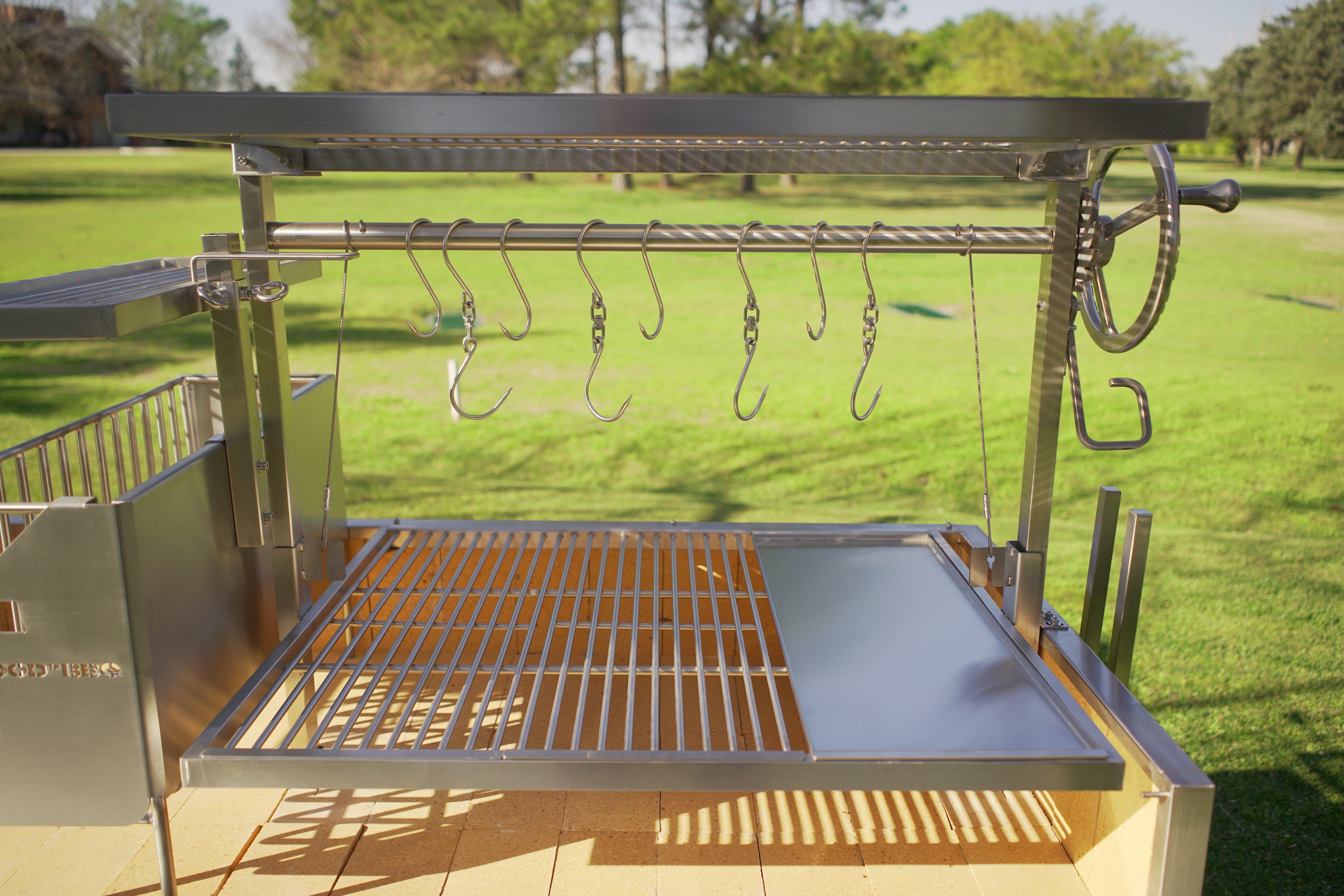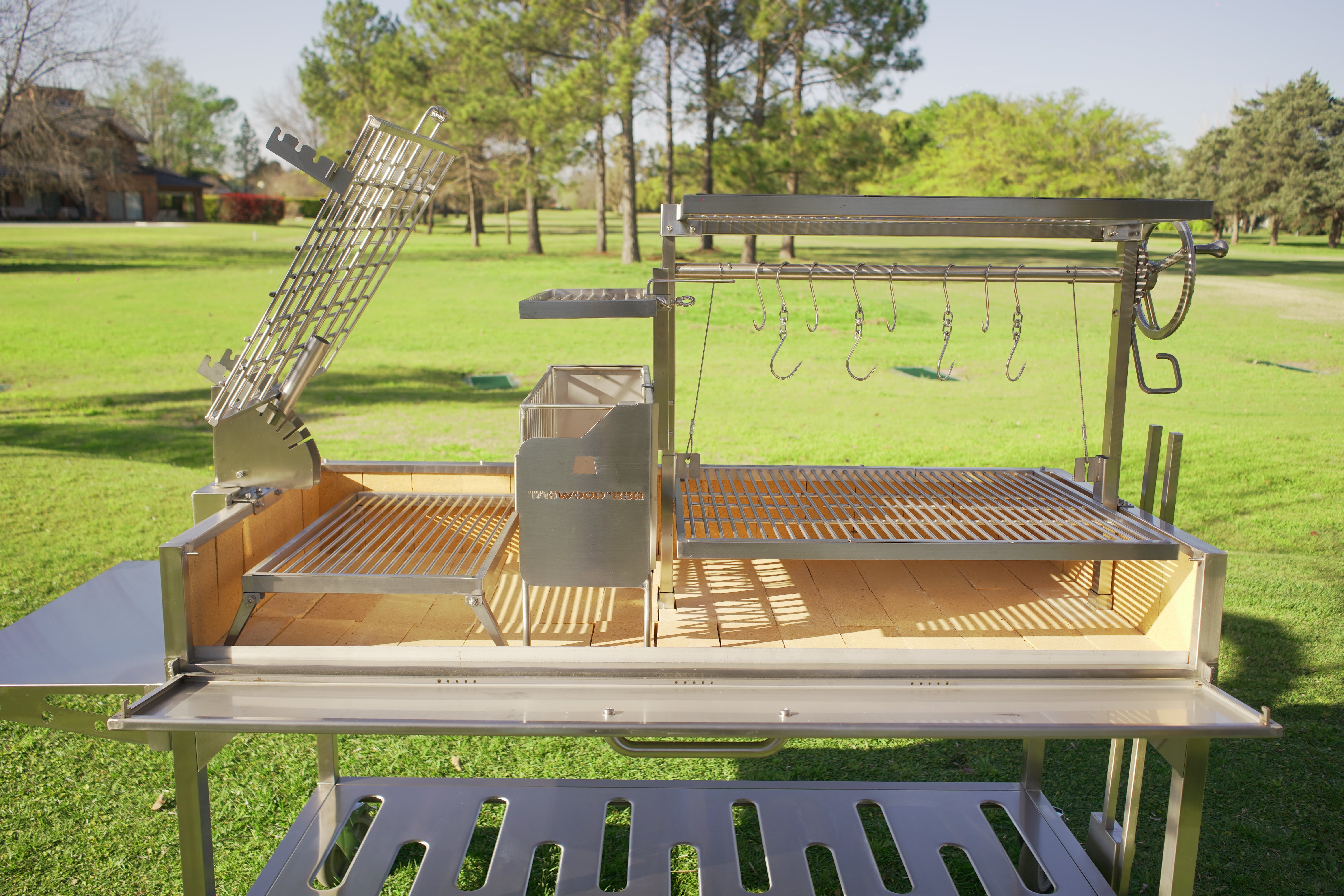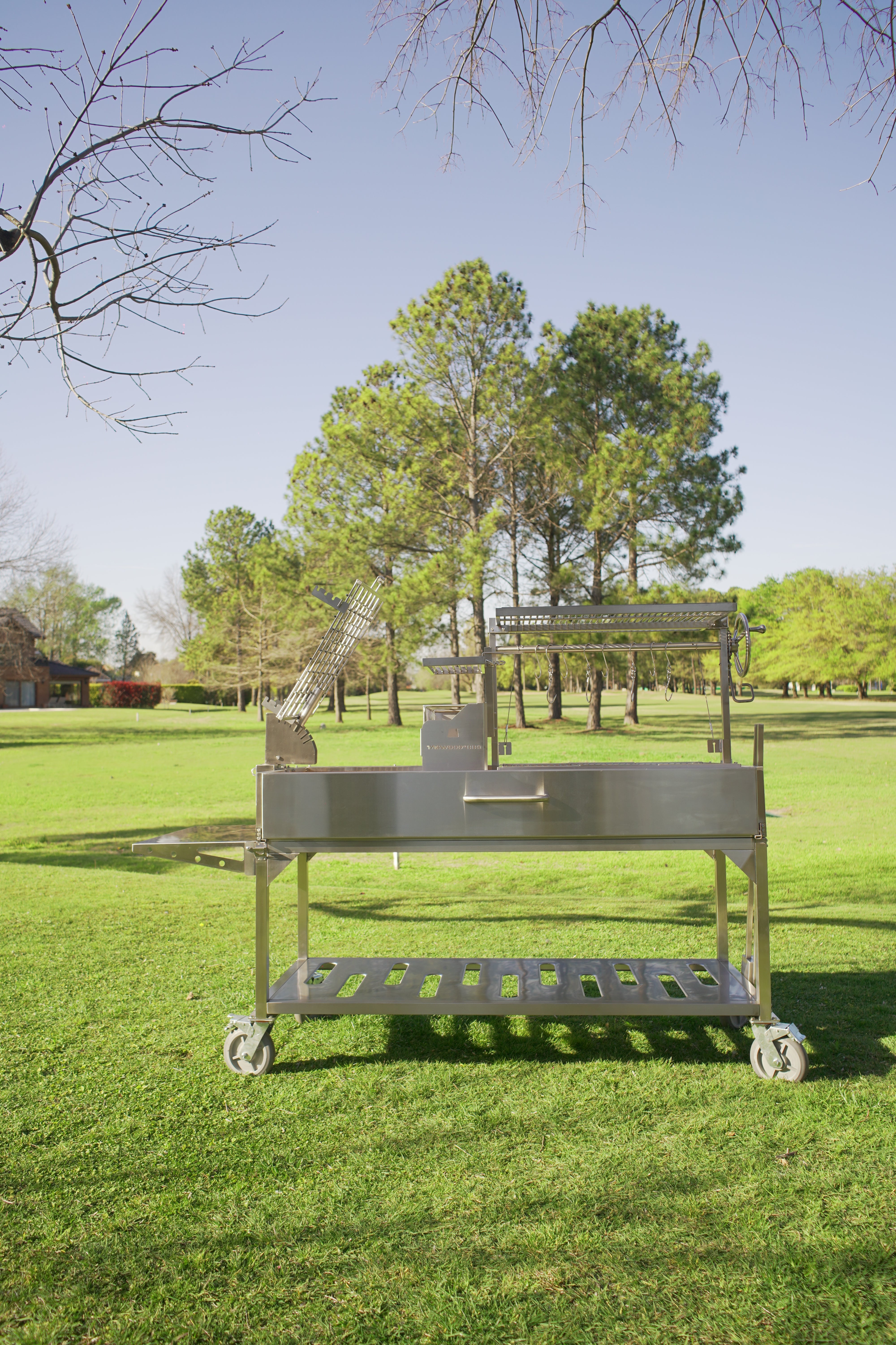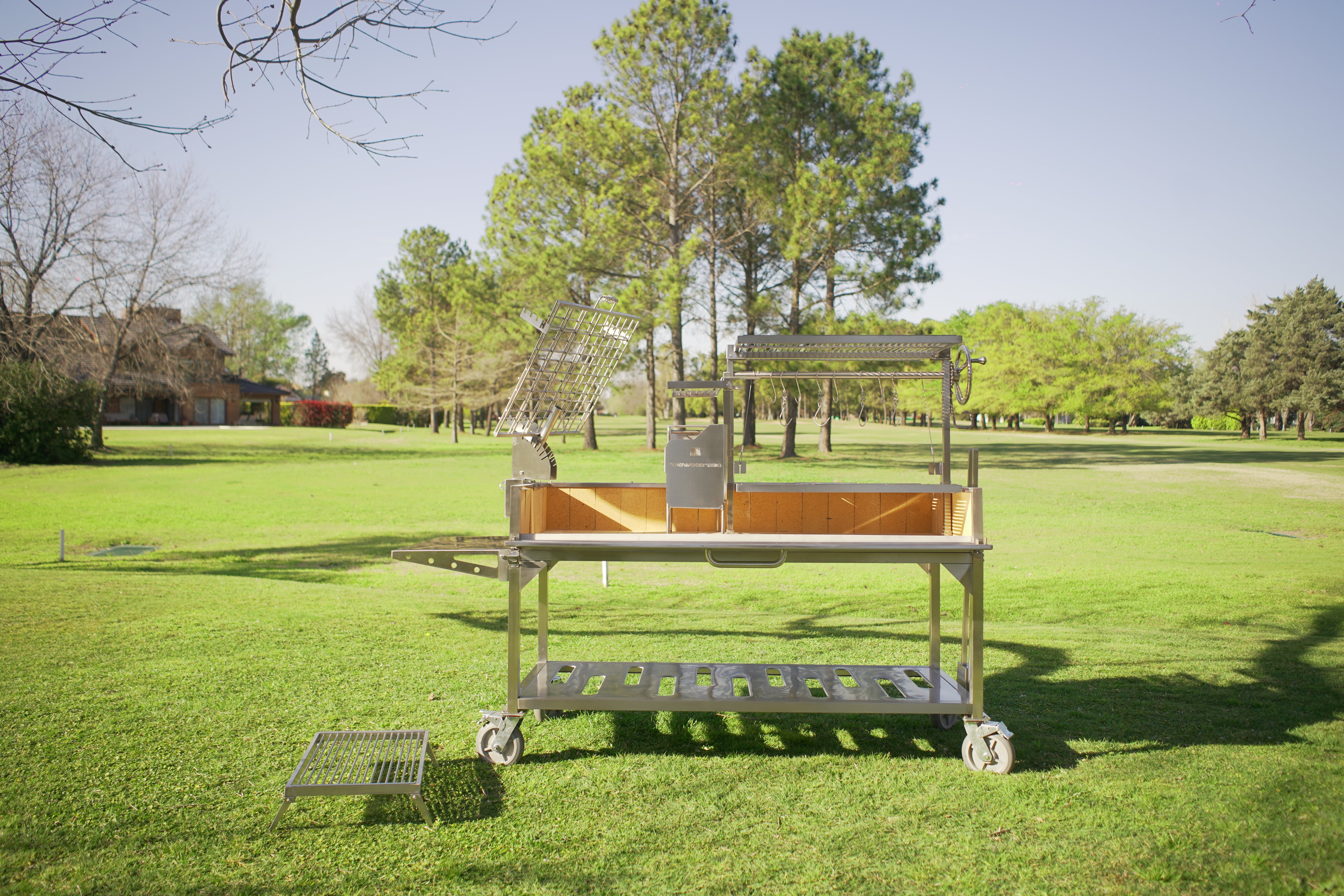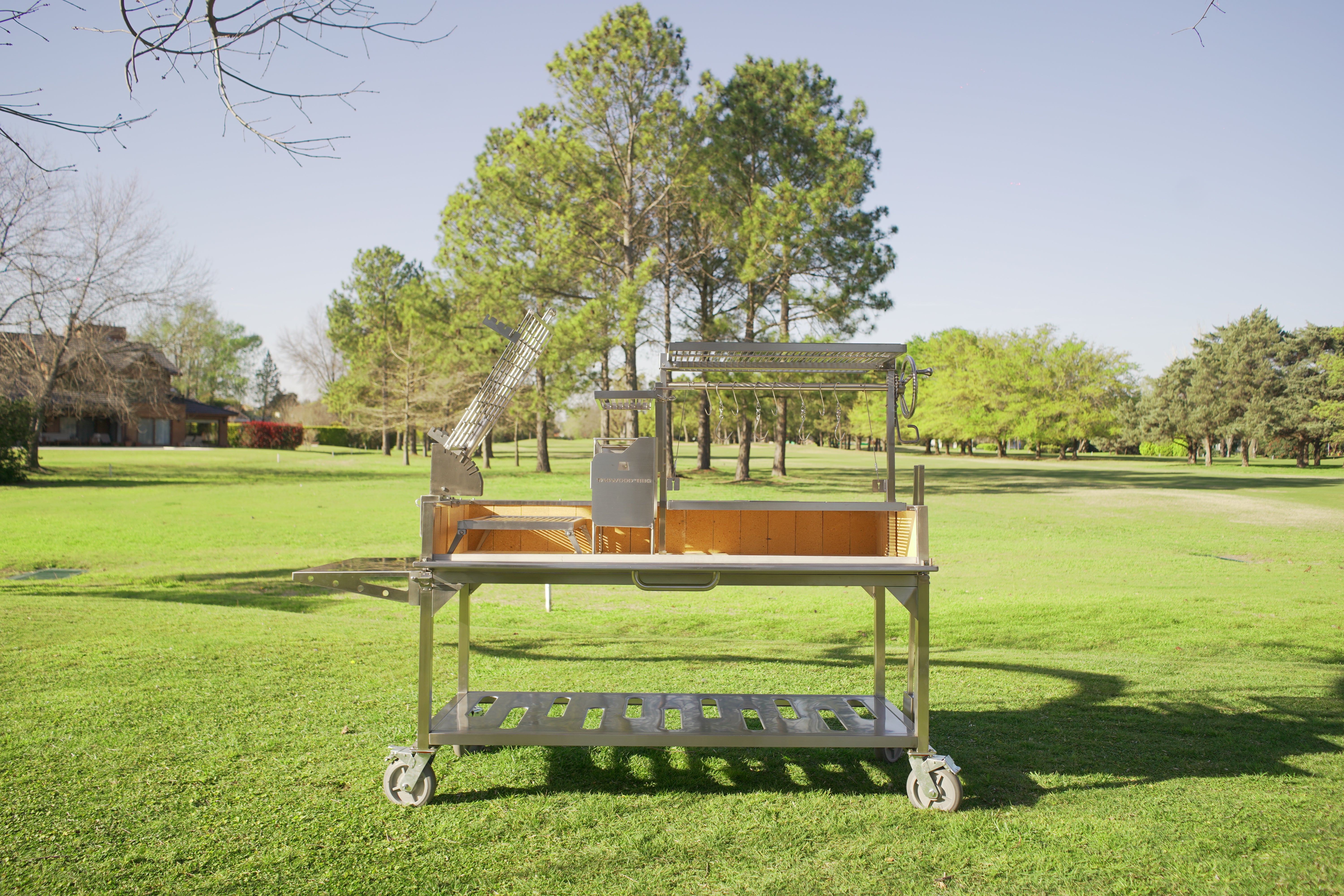 Made entirely of SS 304. Regulate the height manually and innovative asador style with OPEN FIRE cooking. With 360 rotation for easy handling.