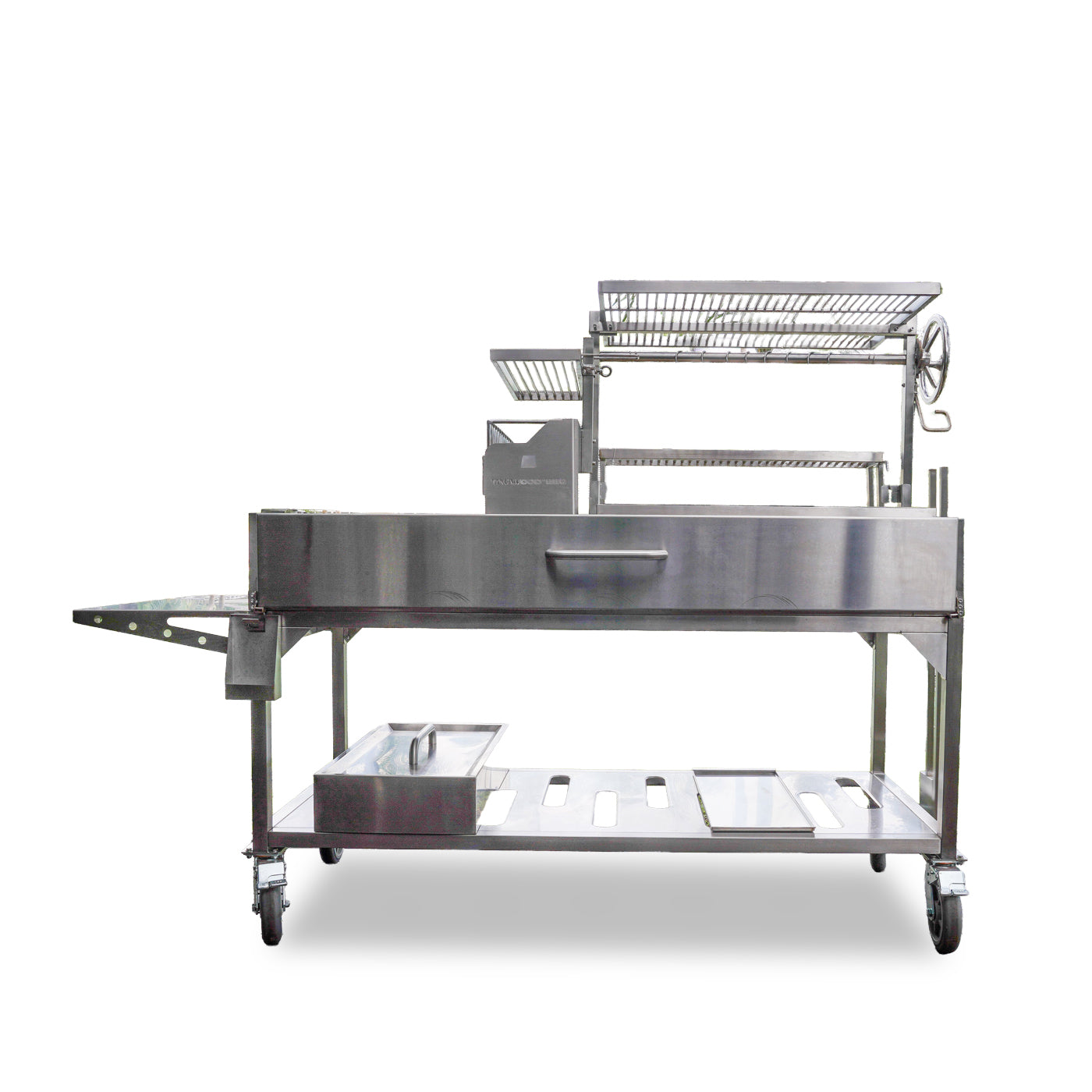 Mit dieser Funktion können Sie die Höhe der Roste anpassen, um die Kochtemperatur präzise zu steuern. Drehen Sie einfach das Rad, um die Hauptroste je nach Bedarf anzuheben oder abzusenken: näher an den Kohlen für mehr Hitze zum Anbraten oder weiter weg für weniger Hitze. perfekt für langsames Garen. Diese Eigenschaft findet man häufig bei südamerikanischen Grills und sie wurde entwickelt, um Ihnen die volle Kontrolle über Ihr Grillerlebnis zu geben.