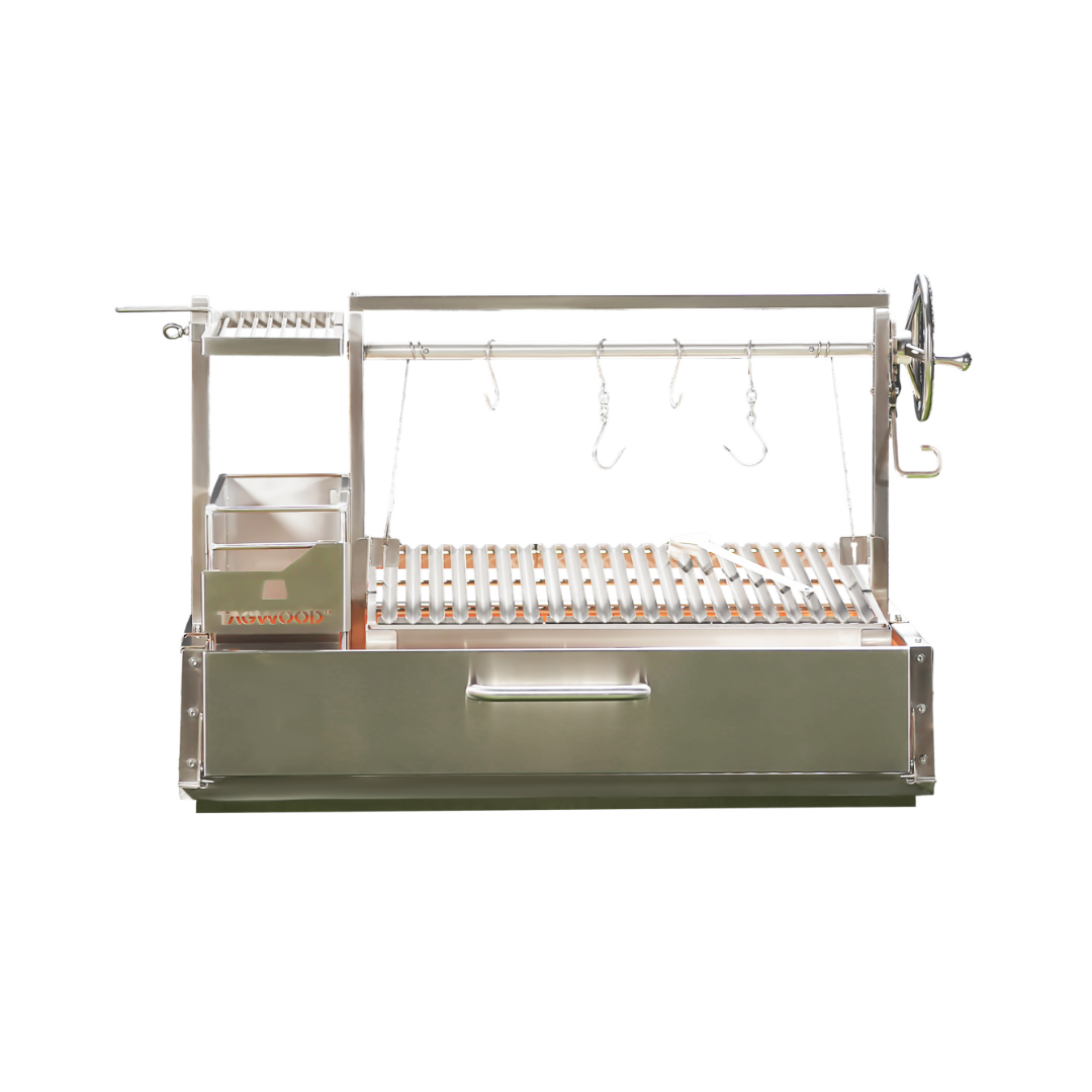 The firebox, also known as a brasero, streamlines the process of lighting wood or charcoal, making it faster and requiring less effort. It ensures the fire stays lit and keeps it distanced from the food. Whether you prefer firewood, charcoal, or a mix of both, this feature accommodates your grilling style. For optimal results, lump charcoal and firewood come highly recommended. Once the coals are adequately heated, they simply drop below, offering a straightforward and effective way to ignite the fire and grill in the authentic style of a gaucho.