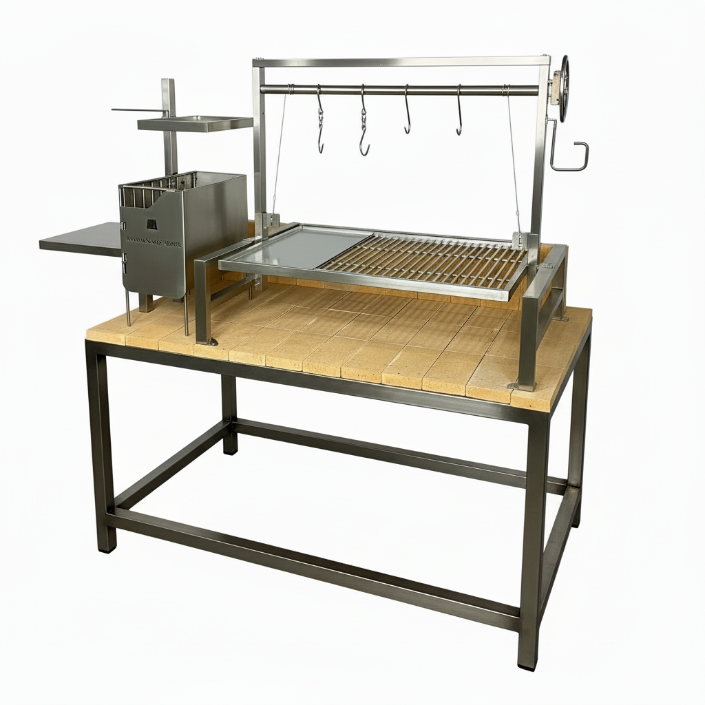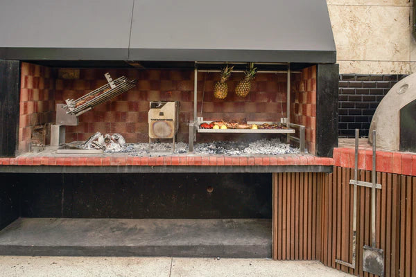This feature enables you to adjust the grates' height to precisely control the cooking temperature. Simply turn the wheel to raise or lower the main grates based on your needs: closer to the coals for more heat to sear, or further away for less heat, perfect for slow cooking. It's a characteristic commonly found in South American barbecues, designed to give you complete mastery over your grilling experience.