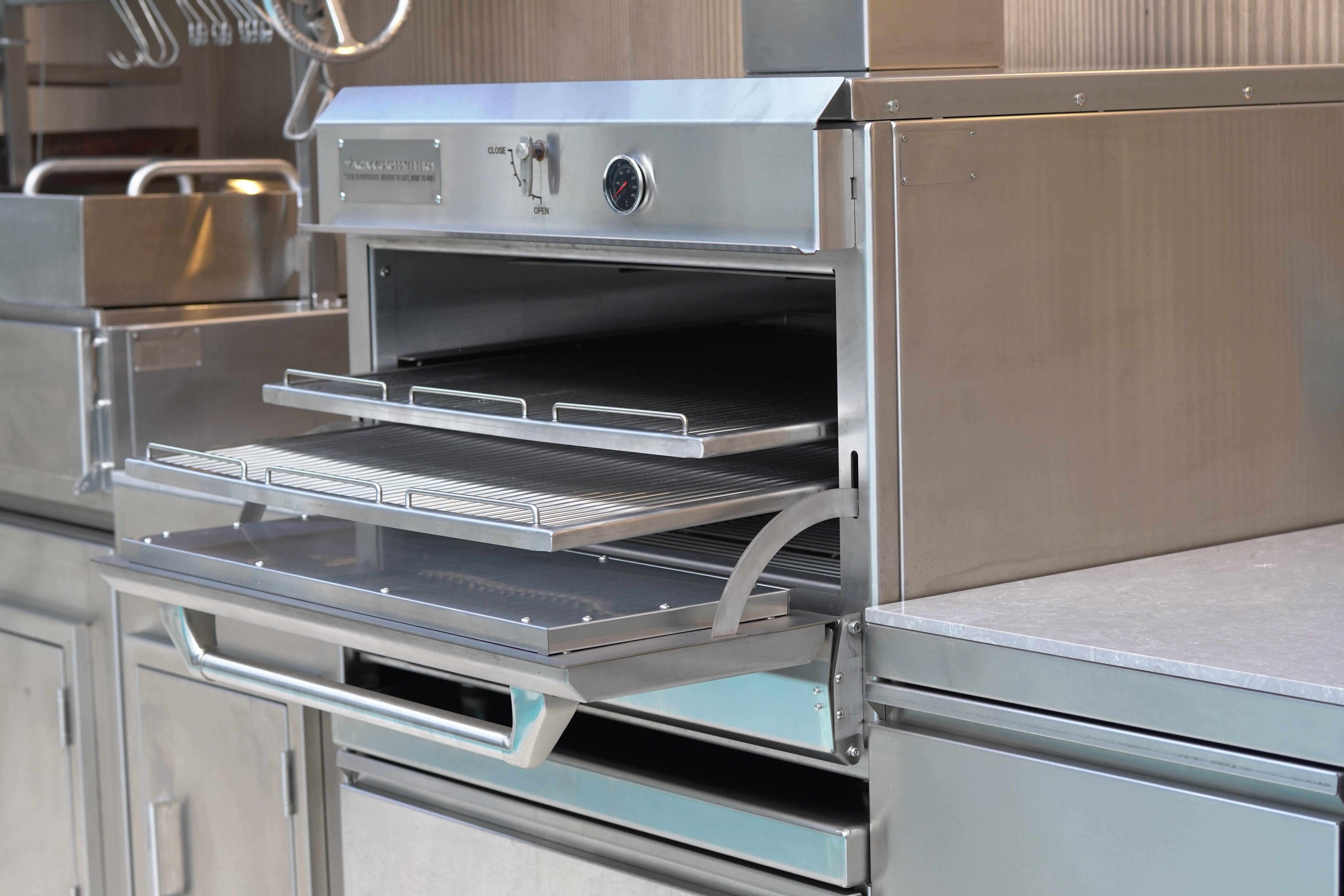 Charcoal and firewood oven fire grill built entirely from 304 stainless steel.